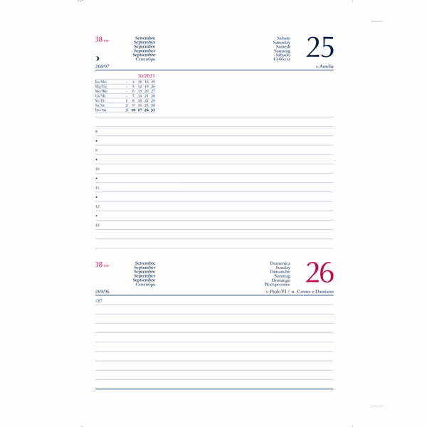 Agenda giornaliera a blocco fisso, copertina in carta imbottita, carta bianca con stampa a due colori. Sabato/Domenica abbinati.