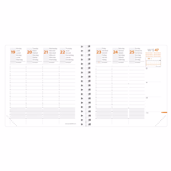 Agenda settimanale da ufficio rilegatura con spirale. Una settimana su due pagine. 13 mesi da dicembre a dicembre, rubrica amovibile, 32 pagine di appunti riposizionabili, anno-Planing pieghevole. Rivestimento in grana effetto pelle, chiusura con elastico verticale e cucitura a sellaio tono su tono. Carta bianca certificata PEFC, stampa in quadricromia. Edizione multilingue.