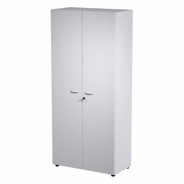 Armadio a 2 ante battenti alte con serratura. 3 ripiani spostabili + 1 fisso. Dimenzioni: L90 x P45,8 x H200 cm. Linea di armadi componibile particolarmente robusti e stabili, costituiti da struttura alta 200cm e completabili con sopralzo alto 40cm. Grande profondità di 46cm e larghezza di 90 cm. Struttura spessore 18mm. Lato posteriore rifinito da ambo i lati con pannello rigido in spessore 10 mm. Ripiani interni in sp. 25mm. Piedini regolabili per la massima stabilità.