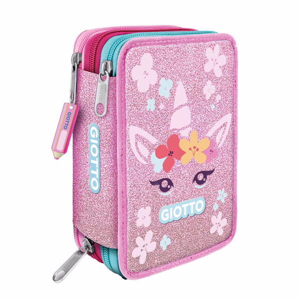 Astuccio a 3 scomparti in poliestere 900D impermeabile dotato di cerniera in metallo. Contenuto: 1 colla stick da 10gr, 1 righello 15cm, 1 maxi gomma No-Sign, 1 temperamatite c/serbatoio, 1 forbice, penna Tratto Cancellik rosso e blu, 1 penna Tratto Uno Green nero, 1 matita HB, 1 Matita 2B, 18 pennarelli Turbo Color e 18 pastelli Supermina 4mm.