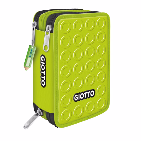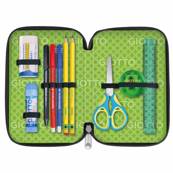 Astuccio a 3 scomparti in poliestere 900D impermeabile dotato di cerniera in metallo. Contenuto: 1 colla stick da 10gr, 1 righello 15cm, 1 maxi gomma No-Sign, 1 temperamatite c/serbatoio, 1 forbice, penna Tratto Cancellik rosso e blu, 1 penna Tratto Uno Green nero, 1 matita HB, 1 Matita 2B, 18 pennarelli Turbo Color e 18 pastelli Stilnovo mina 3,3mm.