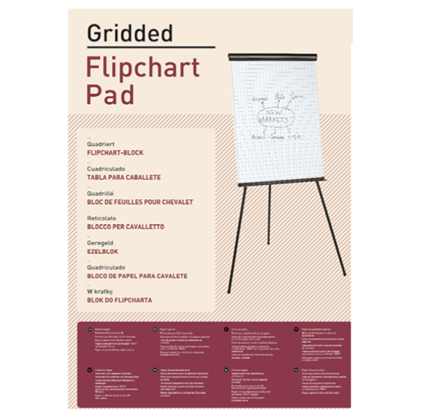 Blocco per lavagna in carta bianca 70gr a quadretti da 2,5cm. Blocco da 20fogli formato 65x98cm. Perforazione universale che si adatta alla maggior parte delle lavagne portablocco in commercio.