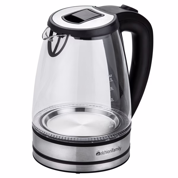 Bollitore Mr Boil cordless con caraffa in vetro da 1,7L. Potenza: 2200W. Spegnimento automatico all’ebollizione e autospegnimento in assenza di liquidi nella caraffa. Filtro smontabile e lavabile. Base con salvaspazio per il cavo. Indicatore livello acqua e luce LED blu di funzionamento. Alimentazione: 220-240V ~ 50Hz. Dimensione: 16x22x21cm.