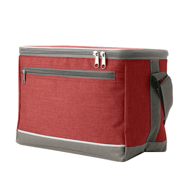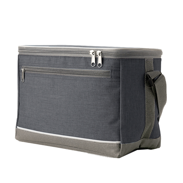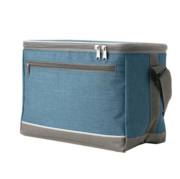 Borsa termica in tessuto tecnico antigraffio. Capacità 6 litri, può contenere 6 lattine da 66cl. Dotata di tasca anteriore e tracolla estensibile. 4 colori assortiti (verde chiaro, rosso, blu petrolio, grigio scuro).