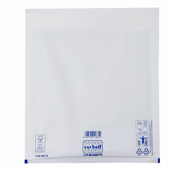 Sacco in carta bianca certificata FSC imbottito con pluriboll. Polietilene a bolle. Termosaldato su tre lati.Lembo autoadesivo protetto da Strip