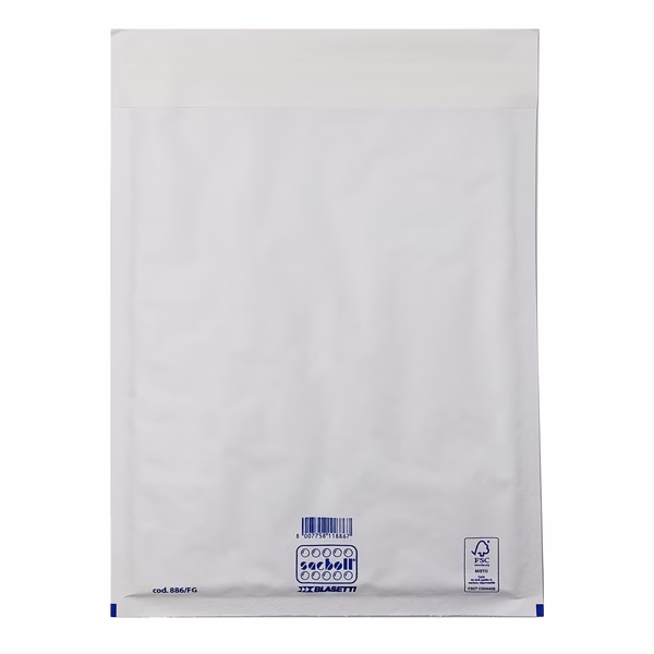 Sacco in carta bianca certificata FSC imbottito con pluriboll. Polietilene a bolle. Termosaldato su tre lati.Lembo autoadesivo protetto da Strip