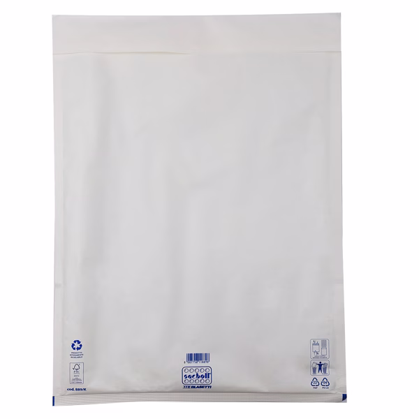 Sacco in carta bianca certificata FSC imbottito con pluriboll. Polietilene a bolle. Termosaldato su tre lati.Lembo autoadesivo protetto da Strip