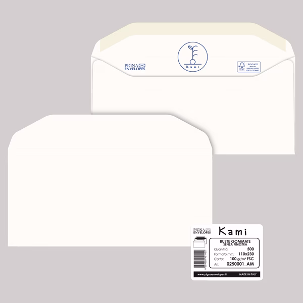 Busta Kami Gommata – senza finestra – 11 x 23 cm – 100 gr – carta riciclata FSC® – bianco – Pigna – conf. 500 pezzi