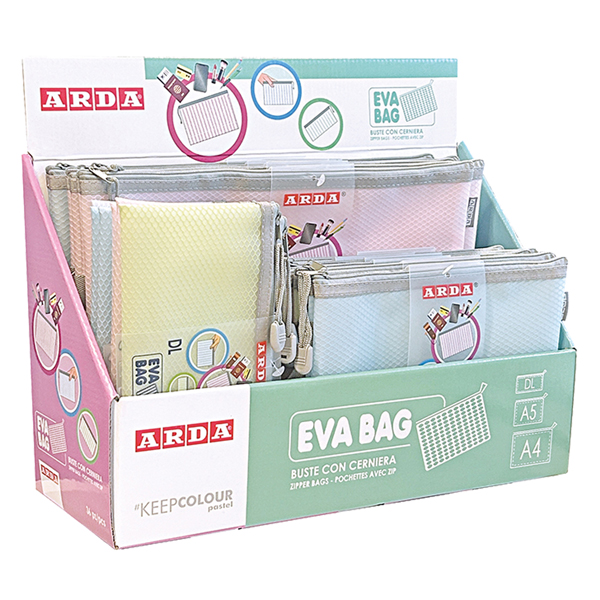 Buste con zip – 3 formati assortiti – EVA – colori pastello – Arda – display 36 pezzi