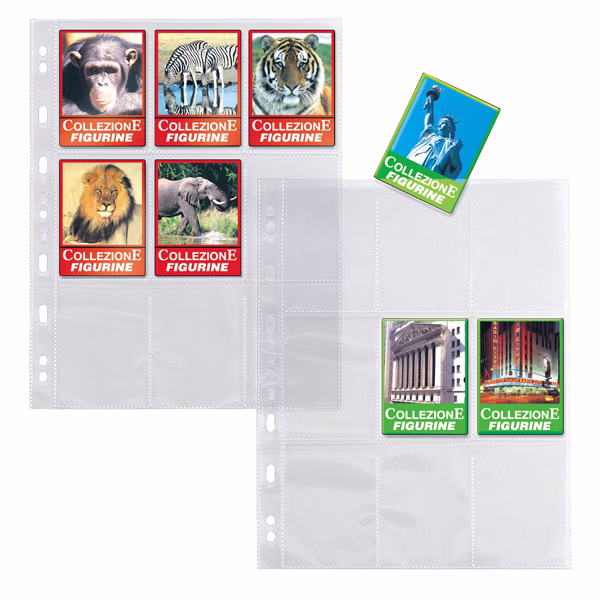 Buste porta figurine con foratura universale in PP liscio. Dotate di 9 spazi per la raccolta di figurine. Formato esterno 210x297mm. Contiene 9 tasche da 60x90mm.