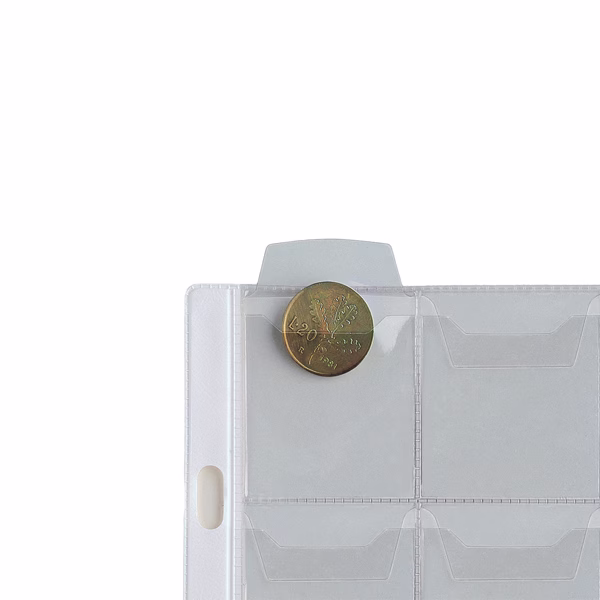 Buste con foratura universale rinforzata in PVC per la raccolta di monete di varie dimensioni. Dotate di chiusura particolare per evitare l’uscita accidentale. Dotata di 30 tasche da 3,4×4,5cm. Formato busta 21×29.7cm. Confezione da 10 buste.