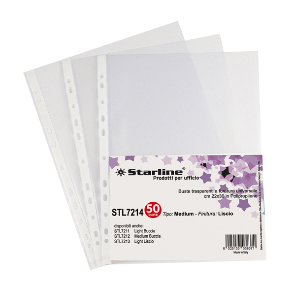 Buste STARLINE con foratura universale rinforzata. Realizzate in polipropilene trasparente finitura liscio. Formato utile 22x30cm.