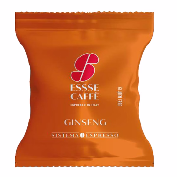 Capsule per caffè ginseng ESSSE Caffè. Ricca miscela con note di caramello, vaniglia e ginseng; ideale come bevanda energetica per affrontare la giornata di lavoro. Compatibili con macchine S12 Essse Caffè.
