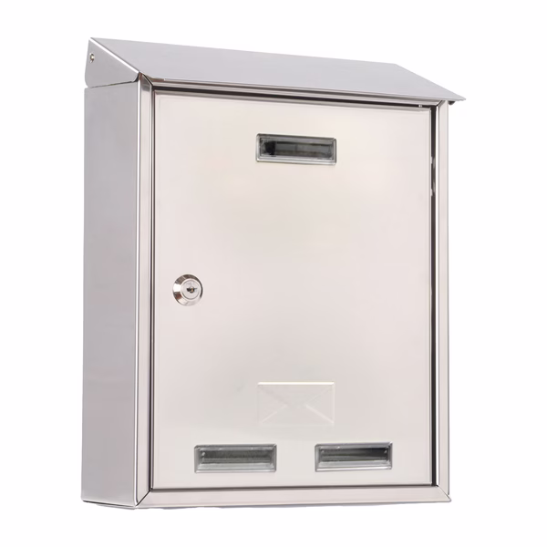 Cassetta postale Elios in acciaio inossidabile tipo 430 2B/SB ricoperto di pellicola bassa adesività (da rimuovere) con tetto antipioggia e serratura a chiave cifrata. Si consiglia di non esporre la cassetta direttamente alle intemperie e di non installarla in zone di mare in quanto potrebbe arrugginirsi.