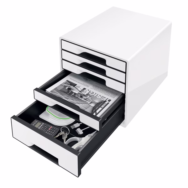Cassettiera Black & White da 5 cassetti: 4 cassetti poco profondi + 1 cassetto alto per accessori da scrivania, come cucitrice, dispositivi mobili, ecc. Cassettiere impilabili fino a 3 moduli. Ergonomico buco presa nella parte inferiore del cassetti poco profondi per una facile rimozione dei documenti. Dimensioni utili: cassetti bassi L245x H34xP325mm, cassetto alto L245xH71xP325mm. Peso Kg3,59. Piedini in gomma. Dimensioni L287xH270xP363mm.