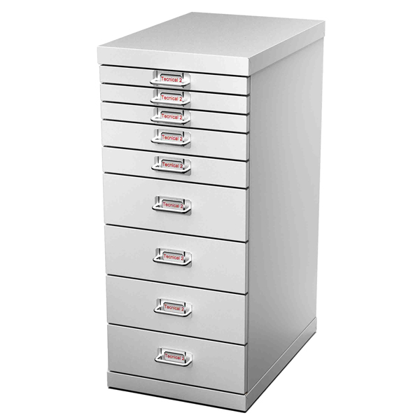 Cassettiere multidrawer a 9 cassetti (4 cass.alti 9,6cm; 2 cass. alti 4,6cm; 3 cass. alti 2,9cm). Dimensioni totali L29 x P43 x H67 cm. Struttura in lamiera SPO 1° scelta spessore 8/10, verniciata a polveri epossidiche previo trattamento di decapaggio e fosfatazione a caldo nel colore grigio RAL 7035. I cassetti sono privi di serratura e dotati di maniglia con portaetichetta cromata. Fornite montate.