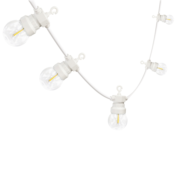 Catenaria con 20 lampadine LED integrate (non sostituibili), bianco caldo 3000K. Lampadine formato G50 (50mm di diametro), luce diffusa. 0,35W/lampadina. 55 lumen / lampadina. Catenaria di 15 metri complessivi. 60cm tra ogni lampadina; prolungabile fino a 3 catene uguali. Munita di trasformatore bassa tensione; uso interno o esterno (IP44). Con gancio di sospensione per ogni lampadina. Perfetta per gazebo, terrazzi, feste, matrimoni, eventi all’aperto.