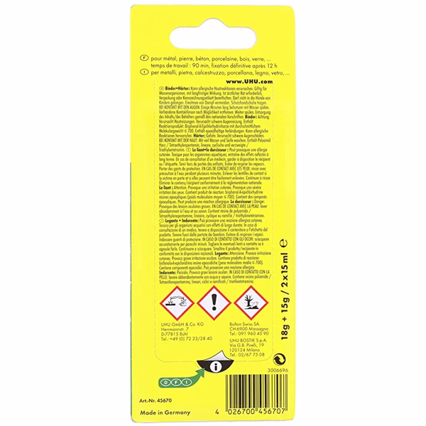 Adesivo bicomponente a base di resina epossidica per incollaggi difficili che richiedono forte resistenza e tenuta. Il prodotto consente incollaggi resistenti nel tempo, agli urti, all’umidità e alle temperature (dai – 20°C ai + 100°C). Ideale per incollare materie plastiche, metalli, pietra, calcestruzzo, porcellana, ceramica, legno, vetro e derivati del vetro, polistirolo espanso.