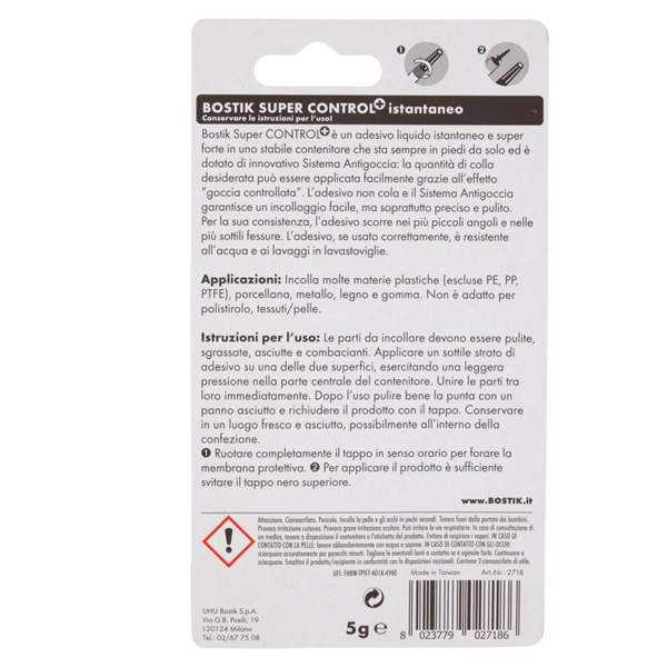 Adesivo cianoacrilicato liquido istantaneo super forte, dotato di innovativo sistema antigoccia per un incollaggio facile, preciso e pulito. Ideale per incollaggi di precisione e piccole dimensioni. Incolla quasi tutti i materiali solidi e flessibili come cuoio, varie materie plastiche, fra cui PVC rigido, ABS, PS, resine acriliche, policarbonato, resine fenoliche, porcellana, ceramica, legno, metallo, sughero, feltro. Solo parzialmente adeguato su vetro e non indicato per PE, PP, resine siliconiche e gomma (Si), PTFE, Teflon®, styrofoam, indumenti in pelle e tessuto. Resistente all’acqua e ai lavaggi in lavastoviglie. Non utilizzare a temperature inferiori a +10°C. L’adesivo offre le migliori prestazioni con un livello di umidità dell’aria fra 50 e 70%.
