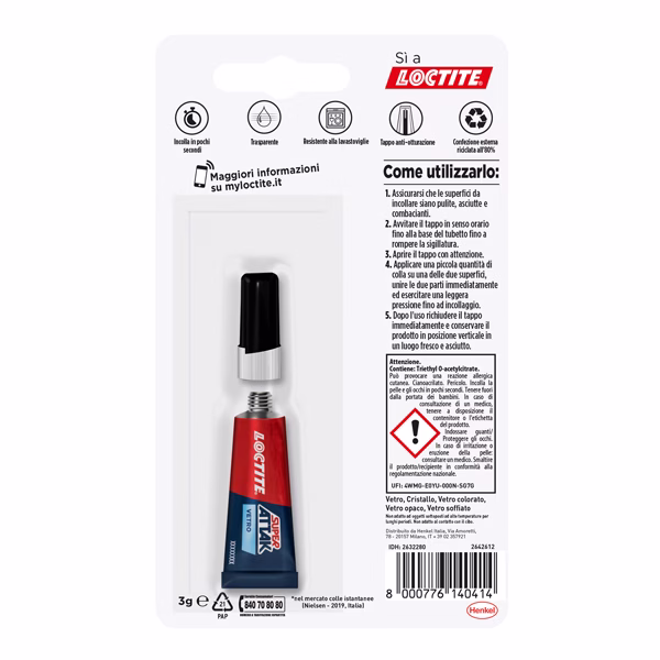 Super Attak Vetro. Adesivo istantaneo specifico per vetro e vetro/metallo. Grazie ad una composizione trasparente, non lascia aloni garantendo un incollaggio invisibile. È inoltre resistente all’acqua, ai detergenti e a temperature elevate (resiste anche in lavastoviglie).