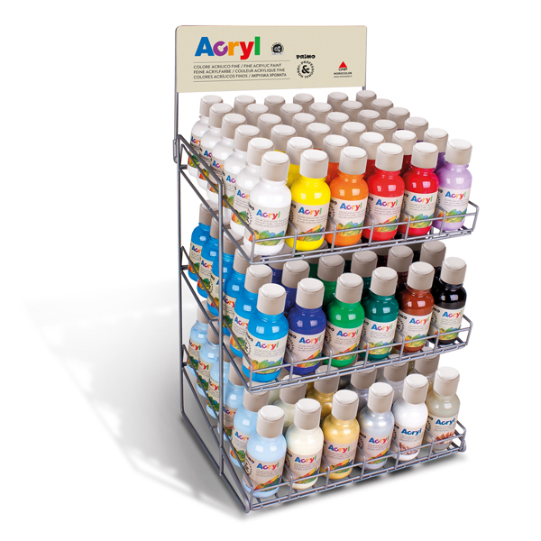 Espositore da banco in metallo con 108 bottiglie da 125 ml (6 pezzi per colore) nelle tinte: Bianco, Giallo primario, Arancio, Vermiglione, Carminio,Lilla, Blu oltremare, CyanVerde brillante, Verde smeraldo, Siena bruciata, NeroAvorio, Azzurro cielo, Argento, Oro, Colla acrilica, Vernice lucida.
