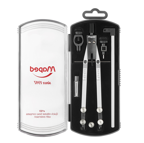 Compasso tecnico in metallo con rapida e veloce apertura (160mm) max cerchio Ø 300mm. Incluso prolunga, astuccio mine da 2mm, supporto per matite e vite di ricambio.