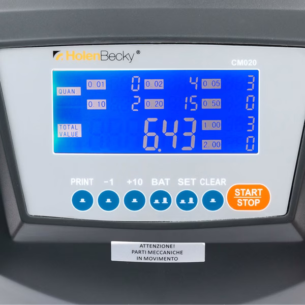 Conta-divide monete Euro in 8 cassetti,silenziosa e veloce, con display LCD di ultima generazione. Dotata di funzione batch memorizzabile e dell’innovativa funzione REPORT di conteggio a display. Permette di effettuare la stampa del report tramite stampante dedicata (cod.87185). Capacità di carico 300/500 monete. Capacità dei cassetti 180/230 monete. Velocità di conta 215 monete/minuto. Display digitale LCD (retroilluminato blu). Alimentazione AC 220V 50Hz. Dimensioni mm. 321 (D) x 270 (H). Peso kg. 4,50