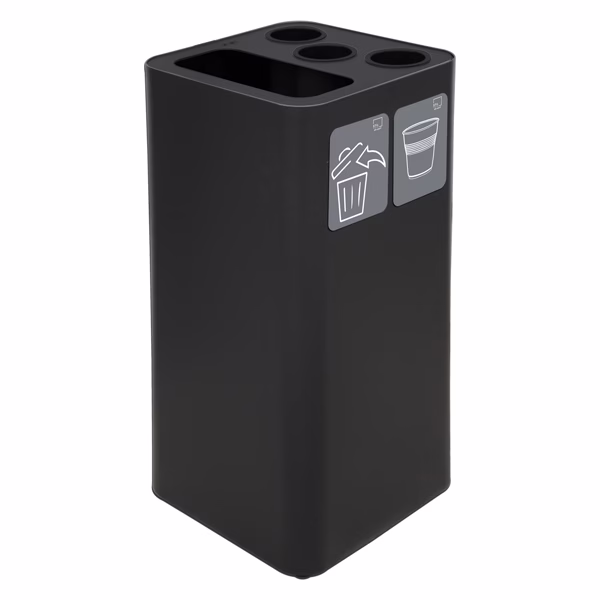 Contenitori da 100Lt per raccolta bicchieri, palette e rifiuti da interno, cover a tre fori con tubi rigidi Ø int. 92mm per impilaggio bicchieri da 200 a 500 cc e uno scomparto (50Lt.) per raccogliere i rifiuti separamente dai bicchieri. Pratico tondino reggisacco ad incastro in acciaio zincato e svuotamento dall’alto. Il fusto con il relativo fondo e la cover forata sono realizzati in acciaio e rifiniti con verniciatura termoindurente; i tubi e i piedini sono realizzati in materiale plastico.