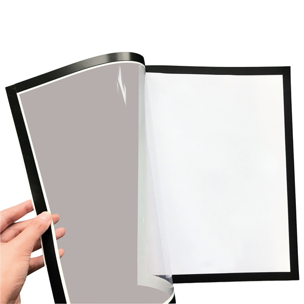 Cornice adesiva Starwall con pannello frontale magnetico in PVC trasparente antiriflesso a marchio Starline. Retro adesivo e magnetico.