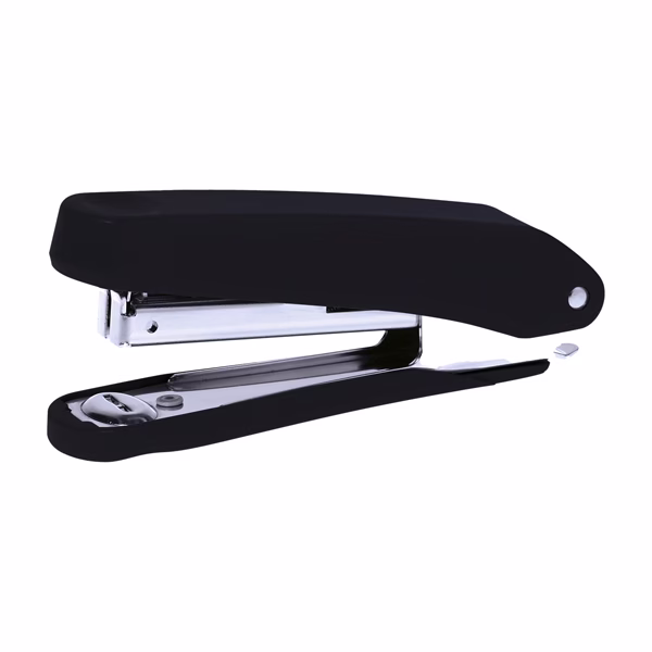 Cucitrice con meccanismo di ricarica dall’alto, indicatore scorta punti e levapunti incorporato.
