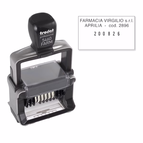 Datario autoinchiostrante per Farmacie, in acciaio Inox. Mascherina di posizionamento per centrare agevolmente le caselline delle ricette mediche. Inchiostro indelebile secondo la normativa DIN ISO 14145-2. Piastra 56x33mm. Altezza data in numeri 4 mm.