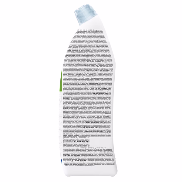 Detergente disincrostante a base di acido citrico ed acido lattico per WC e Orinatoi. Efficace nella rimozione del calcare e dello sporco organico. Formula in gel per aderire al meglio anche sulle superfici verticali. Prodotto certificato EU Ecolabel a basso impatto ambientale. Con ingredienti di origine naturale. Premere entrambe le parti rigate del tappo di sicurezza e svitare. Nuovo beccuccio dotato di 6 fori con azione multi-direzionata del flusso per raggiungere con il detergente una maggiore superficie del WC. Sviluppato in ottica eco-design, facilita e velocizza le attività dell’operatore grazie al cappuccio che rimane fissato alla base del tappo senza la necessità di una totale rimozione. Non si corre pertanto il rischio che il tappo venga disperso nell’ambiente. Premere la bottiglia e spruzzare il prodotto nel water e sotto il bordo. Lasciare agire per 15 minuti, strofinare con una spazzola o un panno abrasivo per rimuovere le macchie più ostinate, poi far scorrere l’acqua per risciacquare. Dosaggio: pronto all’uso. Aspetto: liquido opaco Verde. Non miscelare con prodotti clorinati. Non usare su superfici sensibili agli acidi, es. marmo, marmiglia, travertino ed altre superfici calcaree. CERTIFICAZIONI / CONFORMITA’: I tensioattivi contenuti sono biodegradabili secondo i criteri definiti dalla Direttiva Europea 648/2004/CE e successive modifiche. Licenza EU Ecolabel n° IT/020/036. La dose consigliata consente di risparmiare e di ridurre al minimo l’impatto ambientale.