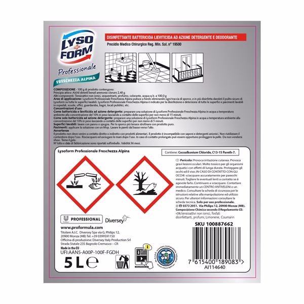 Lysoform freschezza alpina detergente disinfettante in tanica da 5 litri. Elimina qualunque traccia di sporco da tutte le superfici. Non intacca i metalli, non macchia ed elimina i cattivi odori. Attivo a bassissimi dosaggi.