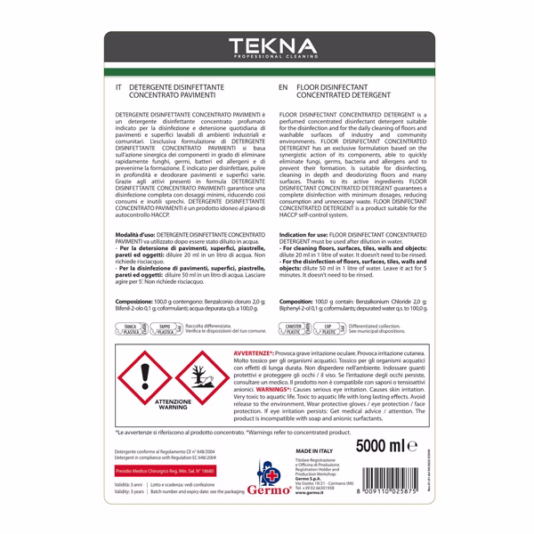 Disinfettante detergente – per pavimenti – concentrato – 5 lt – Tekna