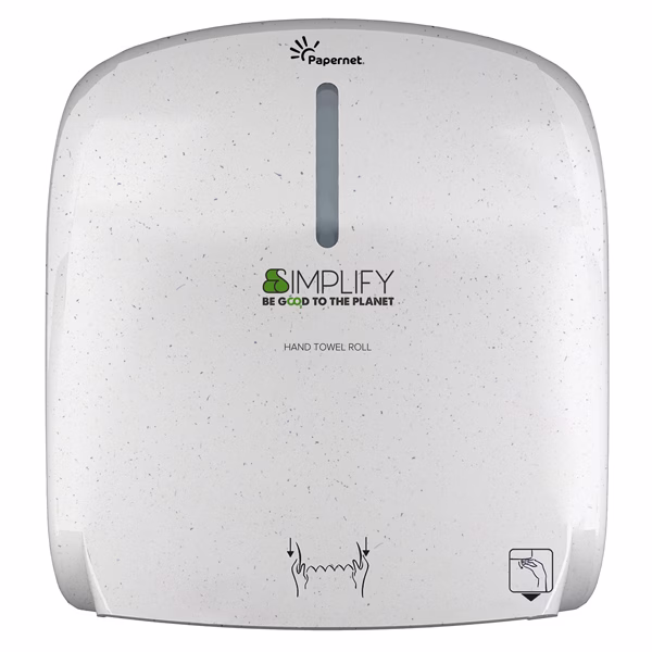 Dispenser Simplify per asciugamani piegati a Z/W (cod. 421336) realizzato per il 75% da materiale plastico post-consumo e materiali in eccesso proveniente dalla lavorazione del legno, al fine di garantire una riduzione degli sprechi nel rispetto dell’ambiente. Dispenser interamente riciclabili. Design pulito ed elegante, realizzato con materiali antiurto per maggiore praticità.