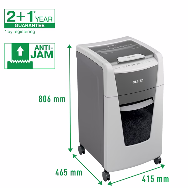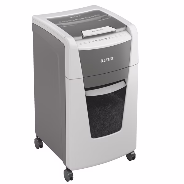 Il distruggidocumenti Leitz IQ è completamente automatico con un’esclusiva funzione di svuotamento pulito. Così intelligente che lavora da solo senza fare rumore, basta inserire la risma di carta (incl. punti e graffette), chiudere il coperchio e si potrà andare avanti con la propria giornata. Ideale per piccoli uffici. Massima sicurezza e prestazioni eccellenti sono garantite con questo distruggidocumenti con meccanismo anti inceppamento, silenzioso e con ciclo di lavoro lungo (60 min). Distruggi automaticamente fino 300 fogli A4 in frammenti con un livello di sicurezza P5 (2x15mm) rilasciati nell’ampio cestino da 60L. Funzionamento semplice grazie ai comandi touch.