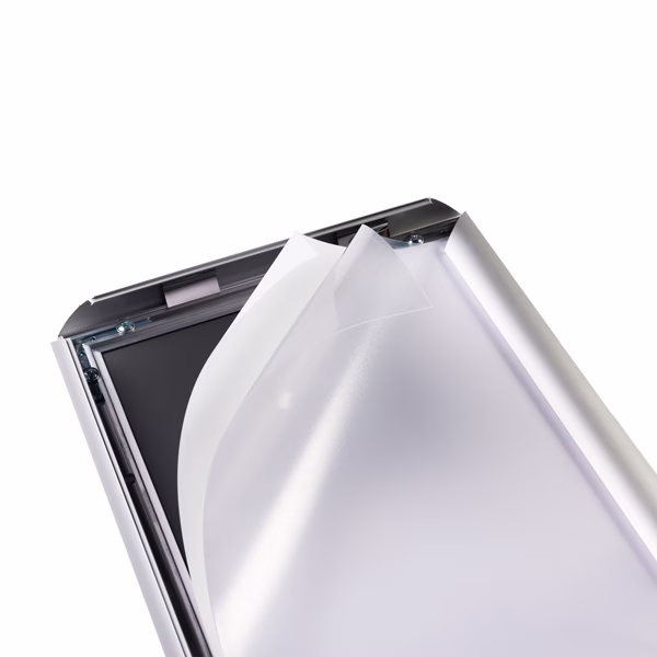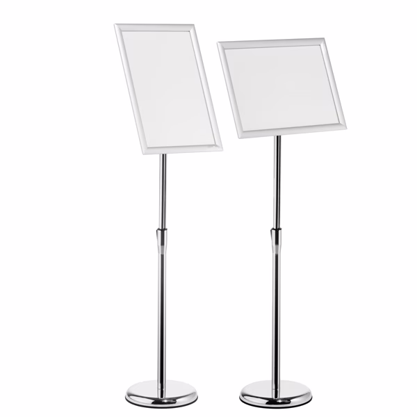 Espositore da pavimento facile da assemblare con robusta cornice a scatto in alluminio anodizzato. Per un’elevata stabilità consigliamo di riempire la base (diametro: 250 mm) con la sabbia. La base rotonda con rivestimento in gomma che previene la formazione di graffi sul pavimento. Altezza regolabile grazie all’asta telescopica (regolabile in step da un’altezza minima di 770cm a un massimo di 120,5cm). La cornice può essere facilmente ruotata dal formato verticale a quello orizzontale. Angolo di lettura regolabile tramite giunto sferico. Foglio di protezione resistente ai raggi UV e antiriflesso. Pannello posteriore in polistirene antiurto.