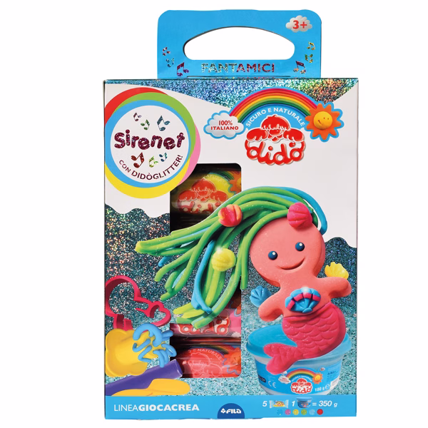 Set composto da: 7 salsicciotti glitter, 1 formina Sirena, trafila, stickers, scenario gioco, guida e accessori.