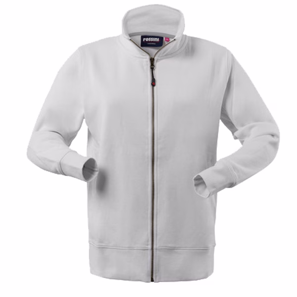 Felpa in cotone (80%) e PL (20%) da donna con chiusura anteriore con cerniera centrale, collo alto, parasudore di colore a contrasto interno al collo, polsi e fascia girovita in maglia elastica, due tasche inferiori a filetto. Su ordinazione tutte le taglie da XS a XXL.