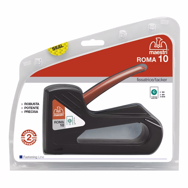 Fissatrice manuale per punti metallici adatta per tutti i lavori di decorazione: tappezzeria, falegnameria, vetrinistica e fissaggio di isolamenti. Capacità di carica: 80 mm. Maniglia verniciata in acciaio indurito studiata per ottenere la massima ergonomia ed una ottima impugnabilità in fase di utilizzo con minimo sforzo. Corpo: ABS caricato 20% fibre di vetro. Infissione: Infigge completamente il punto 53/10 in legno di media durezza. Leva di azionamento ad azione diretta. Profondità di cucitura: 4-10mm. Punti 53/4-6-8-10. Leva di azionamento: Ad azione diretta. Può essere riposizionata senza dover sparare a vuoto. Bloccaggio leva mediante fermo maniglia posteriore. Elemento elastico: N° 1 balestra in acciaio speciale trattato, la cui sagoma è stata studiata per avere la massima
