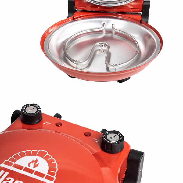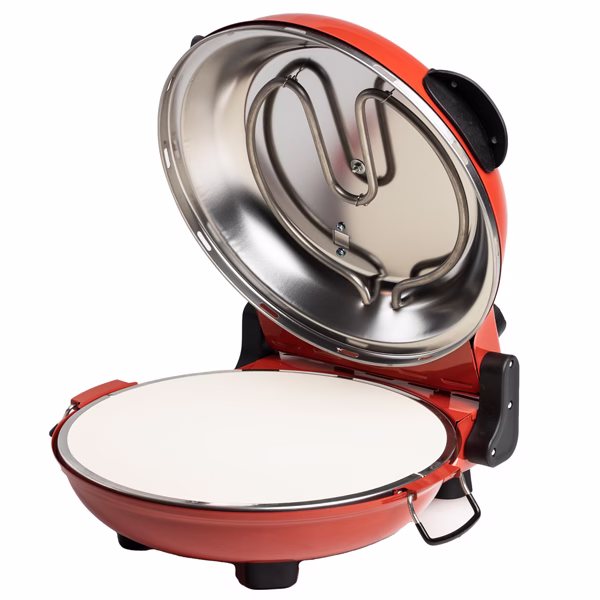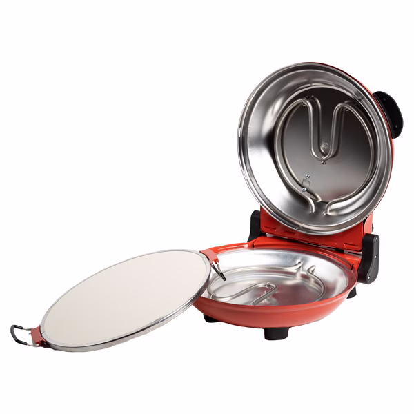 Forno pizza con piatto in pietra refrattaria da Ø31cm reversibile e removibile per una facile pulizia. Pizza fatta a mano cotta in 5 minuti, e quella surgelata in soli 3 minuti. Utilizzabile non solo come forno per pizza, ma ideale per cucinare velocemente anche dolci, torte, toast, etc. Pareti esterne, maniglie e manopole termoisolate. Nessuna formazione di odori o fumo. Doppia regolazione della temperatura (sopra e sotto) con termostati e indicatori LED indipendenti per una cottura perfetta. Doppia resistenza sopra e sotto. Temperatura raggiunta: fino a 380°C. Accessori: 2 palette in legno. Alimentazione: 220-240V ~ 50/60Hz. Potenza: 1200 W. Dimensioni: 35x36x16,5 cm