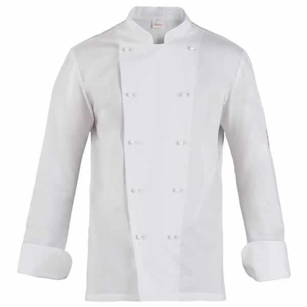 Giacca da cuoco a manica lunga con abbottonatura doppio petto, collo e polsi arrotondati, porta penne sulla manica sinistra. Vestibilità Slim Fit e bottoni estraibili sulla pettorina davanti. Realizzata in tessuto 100% cotone nella variante bianca. Ha la variante manica corta nella giacca Tommaso. Taglie: XS, S, M, L, XL, XXL, 3XL, 4XL, 5XL