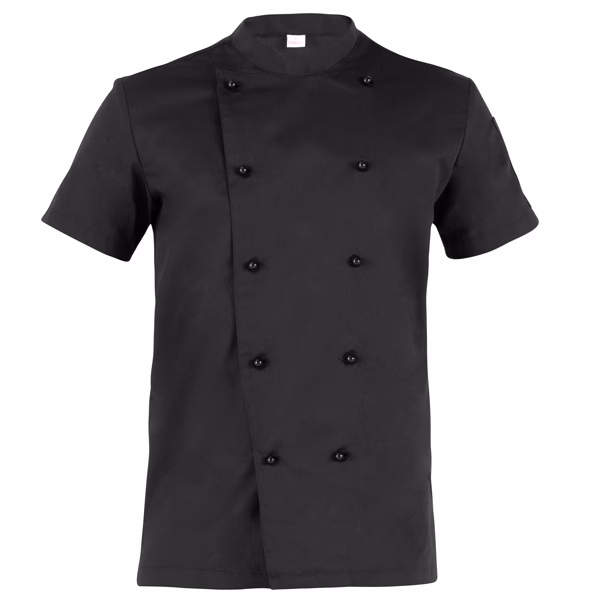 Giacca da cuoco a manica corta con abbottonatura doppio petto, collo arrotondato e porta penne sulla manica sinistra. Vestibilità Slim Fit e bottoni estraibili sulla pettorina davanti. Realizzata in tessuto 65% poliestere 35% cotone nella variante nera. Ha la variante manica lunga nella giacca Adriano. Taglie: XS, S, M, L, XL, XXL, 3XL, 4XL, 5XL