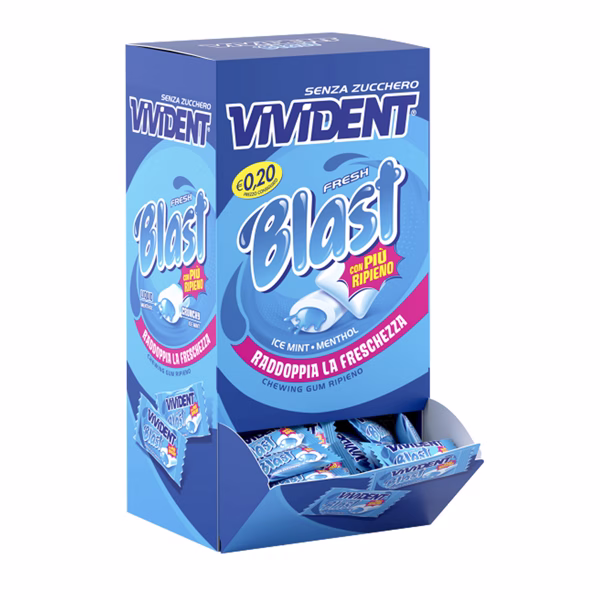 Chewing gum ripieno in confetti con edulcoranti. Senza zucchero. Senza glutine.Ingredienti: edulcoranti (maltitolo, sciroppo di maltitolo, aspartame, sorbitolo, acesulfame K, sucralosio), gomma base, stabilizzante (glicerolo), addensanti (gomma arabica, gomma di cellulosa), maltodestrina, aromi, gelatina alimentare, emulsionanti (lecitine di SOIA, E473), amido, antiossidante (E321), agente di rivestimento (cera carnauba), colorante (blu brillante FCF). Un consumo eccessivo può avere effetti lassativi. Contiene aspartame (una fonte di fenilalanina).