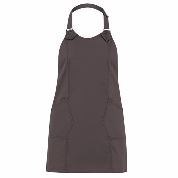 Grembiule Virginia finitura tortora con 2 tasche e allacciatura collo regolabile con fibbia. Colore: tortora. Taglia unica. 98% cotone e 2% elastan.