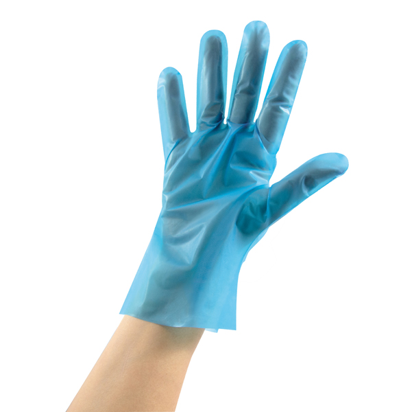 Guanti monouso zigrinati colore azzurro per una presa facile. In polietilene clorurato anallergico. Idonei al contatto alimentare. Riciclabile.