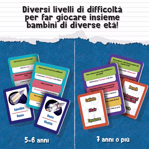 Un gioco di percorso a quiz, basato sui programmi della scuola primaria, per acquisire le prime noioni di astronomia. Grazie ai tre livelli di difficoltà, possono giocare insieme bambini di età diversa. Età consigliata: 5-10 anni.
