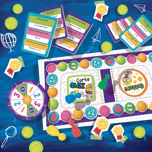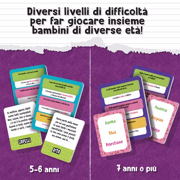 Un gioco di percorso a quiz per scoprire e conoscere il corpo umano. Per vincere bisogna rispondere alle domande e avanzare sul tabellone, superando prove e imprevisti. Chi guadagna più coccarde si aggiudica la vittoria. Il gioco si basa sui programma della scuola primaria e il regolamento, suddiviso in 3 livelli di difficoltà, può coinvolgere anche i bambini più piccoli.