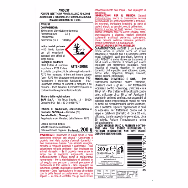 Insetticida in polvere pronto all’uso a base di piretroidi, con barattolo spargitore. La formula garantisce una azione abbattente e residuale prolungata nel tempo. Indicato per: formiche, scarafaggi, insetti striscianti e pulci. Ideale per trattamenti localizzati in ambienti quali garage, cantine, edifici rurali. Azione prolungata: protegge per 8 settimane da reinfestazioni. Composizione: Permetrina pura 0,5% Registrazione: Presidio Medico Chirurgico Reg. n.7078 DI LIBERA VENDITA – Per uso professionale.