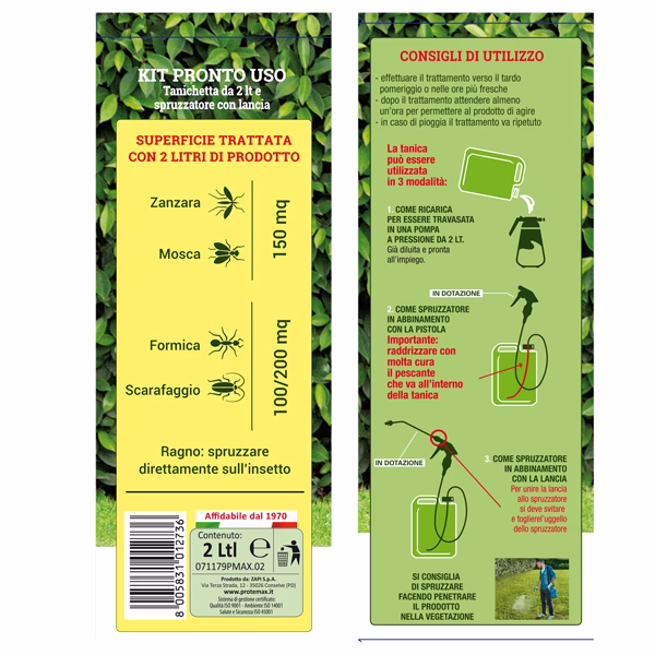 Kit insetticida anti zanzare pronto all’uso con sistema combinato lancia + tanica, permette di poter trattare una superficie più ampia. Il prodotto una volta spruzzato ha un’azione abbattente e snidante prolungata fino a 4 settimane contro molti insetti quali zanzare tigri e comuni, formiche, scarafaggi, ragni. Indicato per vegetazione: prato, siepi, cespugli, alberi ornamentali. Utilizzabile all’interno e all’esterno di ambienti domestici e civili, soglie, davanzali, vialetti.